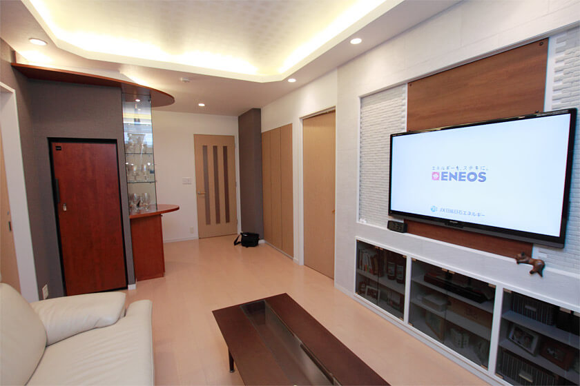E様邸ではお部屋の間仕切りには手を加えず、リビング・ダイニングの天井にて堀り上げ工事を行ったり、クロスの貼り替え、ボードを用いたテレビの壁掛け設置などの工事を行いました。その結果、お部屋の間取りを変えることなく、リフォーム工事の前後で大きく印象の異なる部屋に生まれ変わりました。