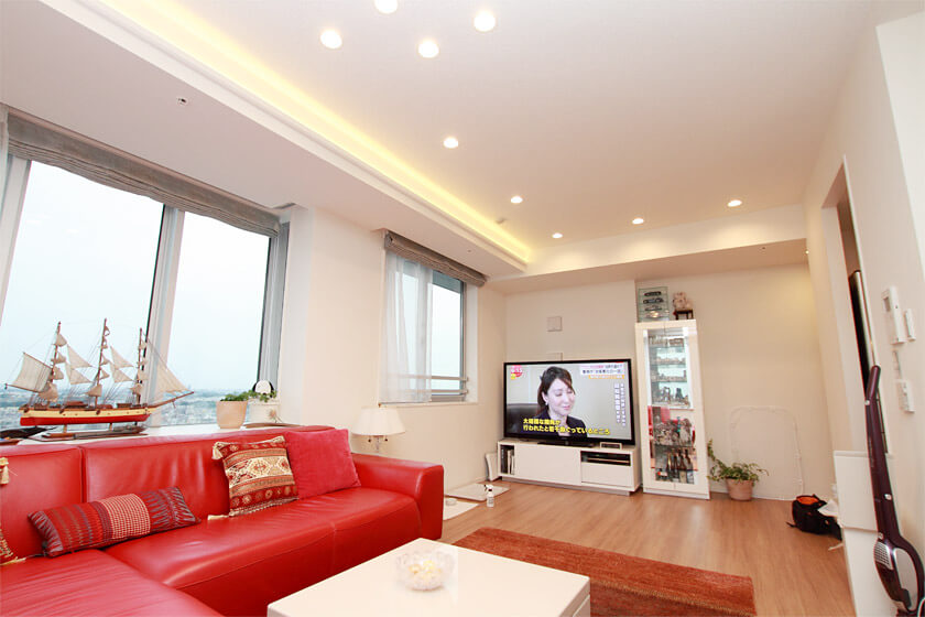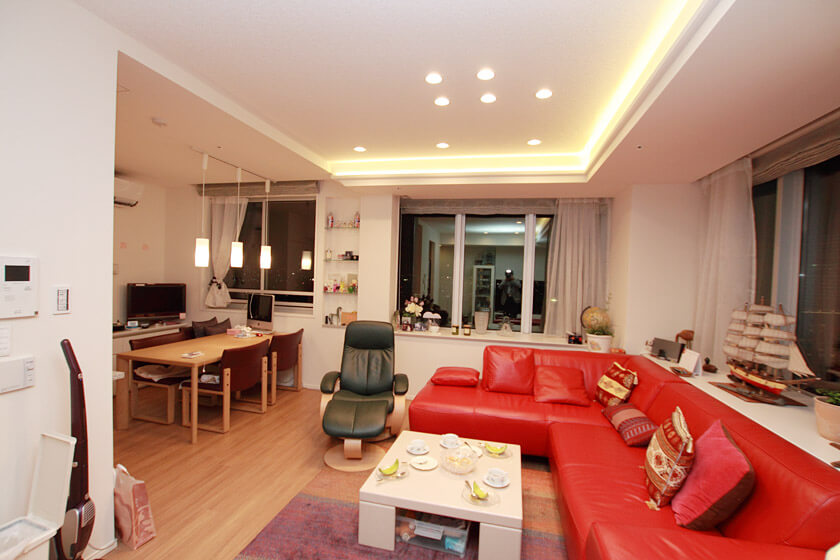 O様邸ではリビング・ダイニングで天井の壁紙の貼替工事や、それに併せてダウンライトの新設工事を行いました。天井部に極細ルーパー造作も行い、ラインLED間接照明を取り付けて、多彩なライティングを楽しめるようにするとともに、意匠性も高めました。