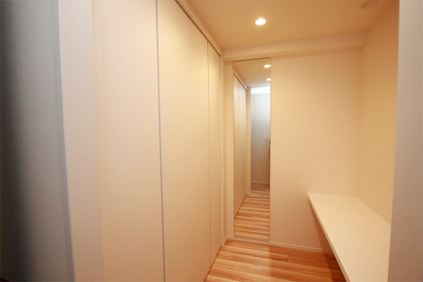 洋室では、一部開口した間仕切りを新設。デスクも造作して、書斎としても活用できるようにしました。また、玄関ではエコカラットと色付ミラーを貼り付け、上品な印象を与える雰囲気にして意匠性を高めつつ、エコカラットが持つ消臭効果と吸湿効果といった機能性も付加させました。