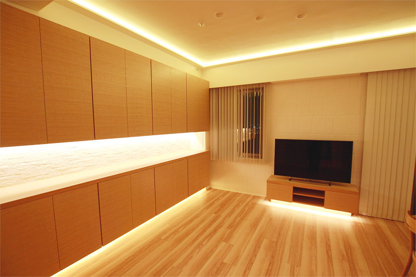 S様邸ではリビング・ダイニングを中心に、キッチンや洋室、玄関でリフォーム工事を行いました。リビング・ダイニングでは、上下セパレートタイプの壁面収納を造作しました。また、天井ルーバー造作工事も行い、間接照明も施して明るい雰囲気のお部屋に仕上げました。キッチンもリビングとの一体感を高めるために目隠し家具を造作し、キッチンカップボードも製作しました。