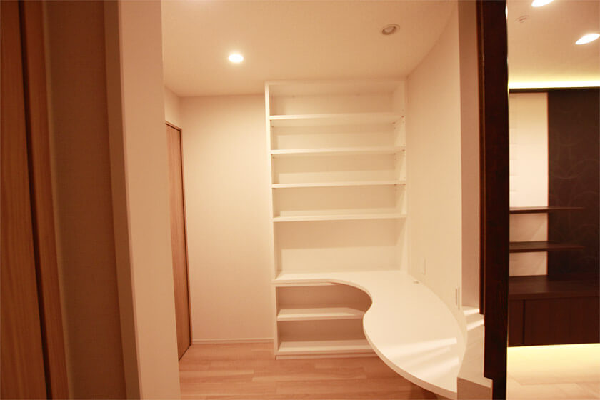 キッチンにはキッチンカップボードを、書斎には曲線状の形態のデスクと、各所にオーダーメイドによる家具を配置して各空間の個性を引き上げました。また、玄関やトイレにはエコカラットを貼り付け、デザイン性を高めるとともに、エコカラットが持つニオイを吸収するなどの機能性も付加させました。