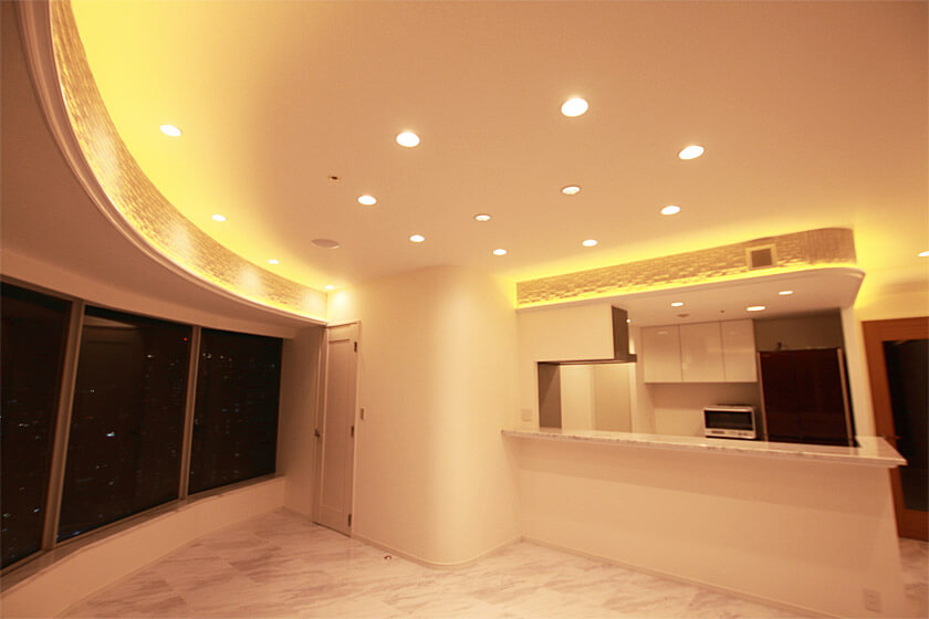 M様がご購入されたタワーマンションの一室にて、リビング・ダイニングを中心としてお住まいの各所にて意匠性を高めるデザインリフォーム工事を行いました。リビング・ダイニングでは天井造作工事を行い、間接照明やエコカラットを組み込むほか、隅の柱にはエコカラットやミラー貼り付け工事を行いました。新たに壁を造作することによって、リビング・ダイニングの隅にもう1部屋を新しく造作しました。