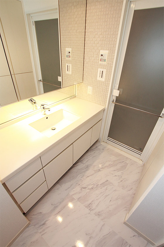 キッチンでもカウンター上部に造作工事を行って、間接照明などを施しました。また、カウンター天板には天然石を貼り、吊戸も新しいものに交換しました。その他にも、洋室でクロス貼替工事やエアコン入替工事を行い、玄関でもエコカラットやミラー貼りによる意匠工事を行い、廊下には新規でアクセントクロスやダウンライトを採り入れました。