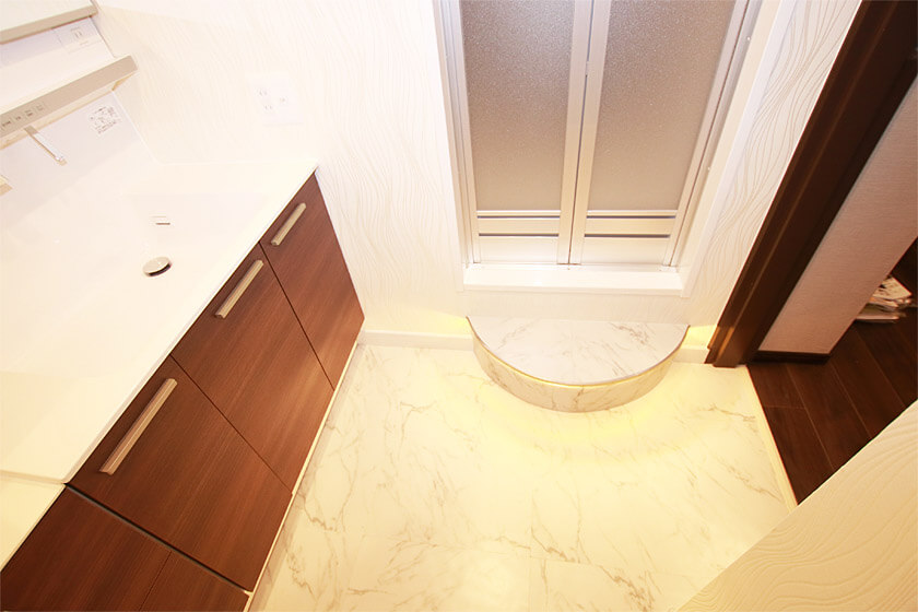 洗面室でも洗面化粧台の入替工事を行い、天井にはスピーカー照明を新設。洗面室から浴室に入るために段差があり、入浴しづらいため、より快適に入浴できるように浴室入口にステップも造作しました。